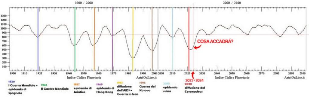 L’anno della trasformazione è proprio questo 2023/2024, così come mostra il grafico dell’Indice ciclico di tensione globale, conflitto e guerra di André Barbault.
