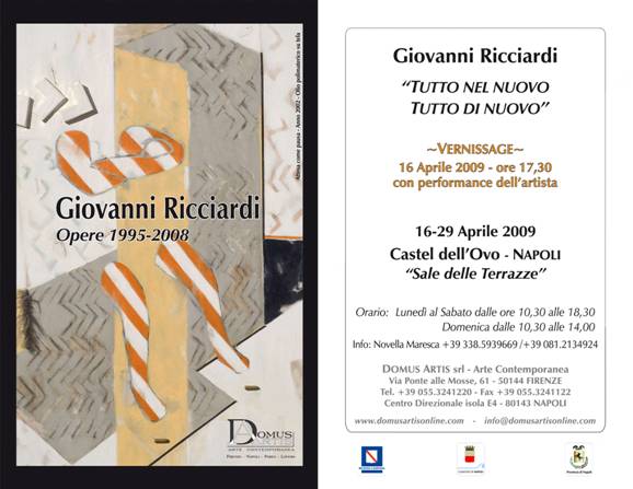 L’ inaugurazione sarà preceduta da una performance dell’artista. Sala delle Terrazze Castel dell’Ovo via Eldorado (Borgo Marinari) – Napoli Domus Artis è lieta di presentare Tutto nel nuovo – Tutto di Nuovo, esposizione personale del pittore napoletano Giovanni Ricciardi, con il patrocinio della regione Campania, della Provincia di Napoli e del Comune di Napoli. In mostra circa cinquanta opere che ricostruiscono, nella Sala delle Terrazze di Castel dell’Ovo, l’articolato percorso del giovane artista. Partito da una formazione accademica, Ricciardi ha sviluppato un linguaggio personale e ricercato, fondato sull’eleganza del segno grafico e sul senso del colore, che dai toni profondi e dalle larghe campiture delle prime opere giunge a cromie accese e brillanti di significativa tendenza pop. La sua attitudine alla sperimentazione lo ha condotto a una originale contaminazione di tecniche e materie, evidente soprattutto nei dipinti in cui la tradizionale esecuzione ad olio si combina con elementi eterogenei come vetro, merletto, proiettili e sagome di metallo. Una ricerca artistica tesa al senso profondo della realtà e degli oggetti, sottolineata dalle opere della serie Bit in cui gli elementi naturali, spesso animati da tinte vivaci e insolite, sono percorsi da inquietanti vuoti.