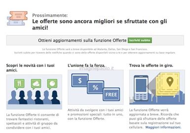 Facebook crea altri servizi: http://www.facebook.com/deals/, sulla vostra bacheca Facebook sta iniziando a mostrare l’invito ad iscriversi al servizio. Casa ci dice? «Le offerte sono ancora migliori se sfruttate con gli amici» quindi si invita al passaparola.