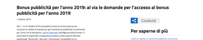 Dal 1° al 31 ottobre 2019 è possibile inviare la comunicazione per l’accesso al credito di imposta per gli investimenti pubblicitari incrementali per l’anno 2019 attraverso i servizi telematici dell’Agenzia delle Entrate.