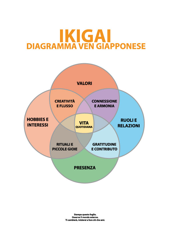 Questo diagramma è opera dell’astrologo Andrés Zuzunaga, nel 2012 è apparso per la prima volta nel libro Qué Harías Si No Tuvieras Miedo (Cosa faresti se non avessi paura?) Di Borja Vilaseca. L’ikigai è l’equivalente giapponese di espressioni italiane quali “ragione di vita”, “ragion d’essere”. Clicca sull’immagine e scarica il PDF da stampare.