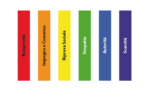 Le scorciatoie sono: reciprocità, scarsità, autorità, consistenza, mi piace, e consenso.