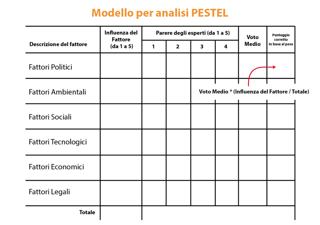 Assegnando i voti per ogni fattore sarai in grado di ottenere un punteggio che ti faciliterà la comprensione dell’Analisi PESTEL.