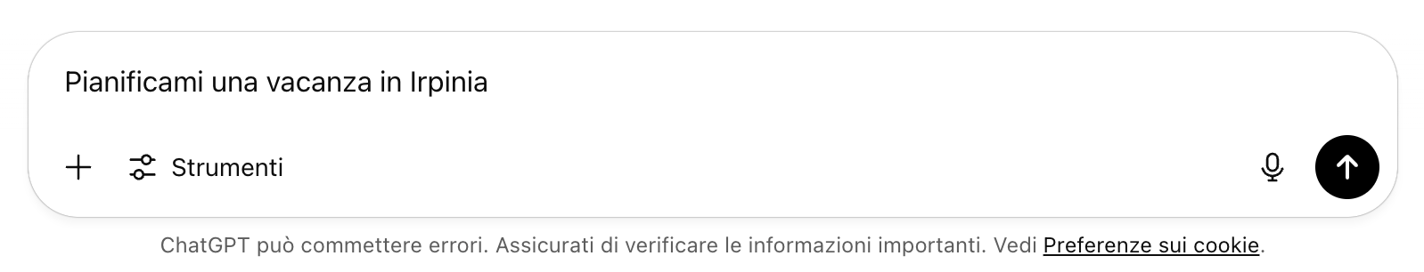 💡 Esempio: Controlla se ChatGPT ha inserito il tuo paese irpino in questo itinerario, scarica il PDF per una bella vacanza in Irpinia pianificata (Esempio dimostrativo generato da ChatGPT):