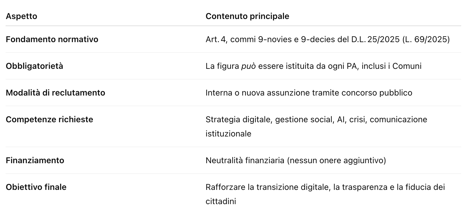 - Comma 9‑novies: stabilisce che le amministrazioni pubbliche possono individuare la figura del social media e digital manager, sia tra il personale già in servizio dotato delle competenze richieste, sia tramite nuove assunzioni autorizzate dalla normativa vigente;