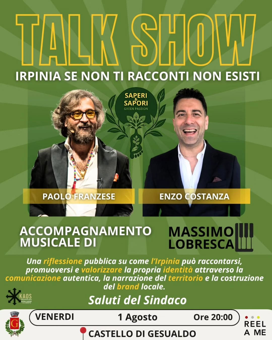 All’interno della rassegna culturale “Saperi & Sapori – Green Passion”, organizzata dall’Associazione Kaos con il patrocinio del Comune di Gesualdo e il supporto dell’agenzia web Reel A Me, questo appuntamento rappresenta un’occasione unica per riflettere sull’identità, la comunicazione e il futuro di un territorio straordinario e troppo spesso dimenticato.