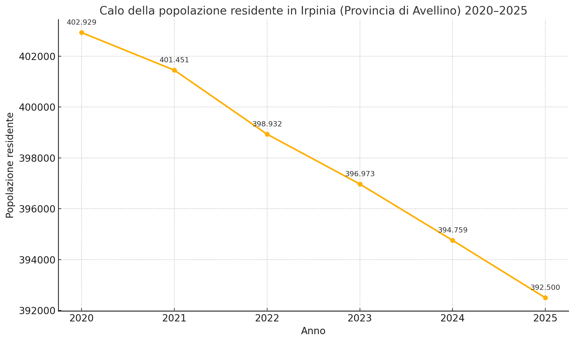 Ecco il grafico visivo aggiornato che illustra chiaramente il calo costante della popolazione residente in Irpinia (provincia di Avellino) dal 2020 al 2025. I dati evidenziano una perdita stimata di oltre 10.000 abitanti in cinque anni.