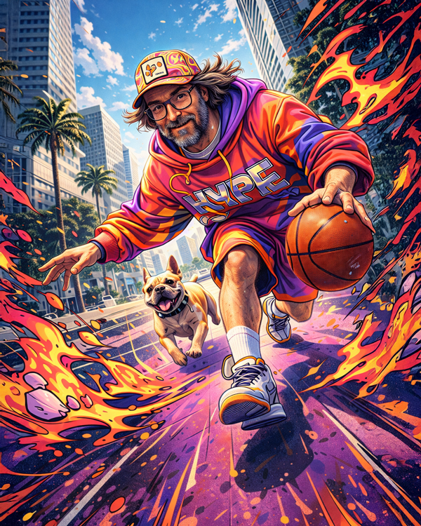 Trasforma questa immagine in uno scatto DSLR a risoluzione 64K di una scena d'azione urbana dinamica e stilizzata, che fonde fotografia realistica con audaci illustrazioni in stile fumetto. Un giovane uomo atletico (stesso volto dell'immagine caricata) è catturato a metà movimento mentre palleggia con un pallone da basket in una strada cittadina, ripreso da una drammatica prospettiva dal basso per enfatizzare il movimento e la potenza. Indossa un outfit streetwear colorato: una vivace felpa con cappuccio oversize con sfumature rosa, arancioni e viola e scritte grafiche audaci, abbinata a pantaloncini atletici coordinati, calzini bianchi alti e sneakers moderne. Indossa anche un cappello a secchiello (bucket hat) a fantasia e occhiali rotondi, con i capelli che fluiscono liberamente nel vento, esaltando il senso di velocità. La sua posa è energica e sicura: un braccio esteso mentre controlla la palla, l'altro teso per l'equilibrio, creando una forte composizione diagonale. La sua espressione facciale è concentrata e determinata, con lo sguardo rivolto in avanti come se stesse caricando attraverso la scena. Accanto a lui corre un cane felice ed energico (un bulldog francese beige di taglia media), con il collare, colto nel mezzo della corsa con la lingua di fuori, aggiungendo giocosità e calore all'azione. L'ambiente è un paesaggio urbano luminoso e soleggiato con alti edifici moderni, palme e un cielo blu vivido con nuvole soffici, che suggerisce una calda località urbana. Il terreno è stilizzato come un ibrido tra un campo da basket e una strada, dipinto in audaci toni viola. Dietro e intorno ai soggetti ci sono effetti illustrati esplosivi: grandi fiamme rosa e gialle, schizzi di vernice e scie di movimento grafiche che si fondono perfettamente con l'ambiente reale. Questi elementi sono contornati da spessi tratti neri, dando all'intera immagine un'estetica da fumetto, pop-art e street-art anni 2000 (Y2K). L'illuminazione è luce diurna brillante con ombre nette, colori saturi e contrasto elevato. L'immagine sembra un fermo immagine di un film sportivo d'animazione o di una campagna di un marchio streetwear.