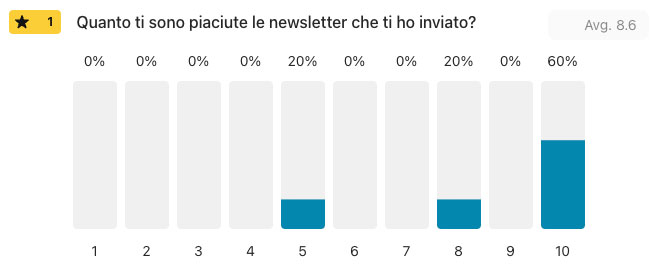 Il sondaggio continua (prova anche tu a farne uno con Typeform). Ecco il grafico per le risposte da 1 a 10 alla domanda: Quanto ti sono piaciute le newsletter che ti ho inviato?
