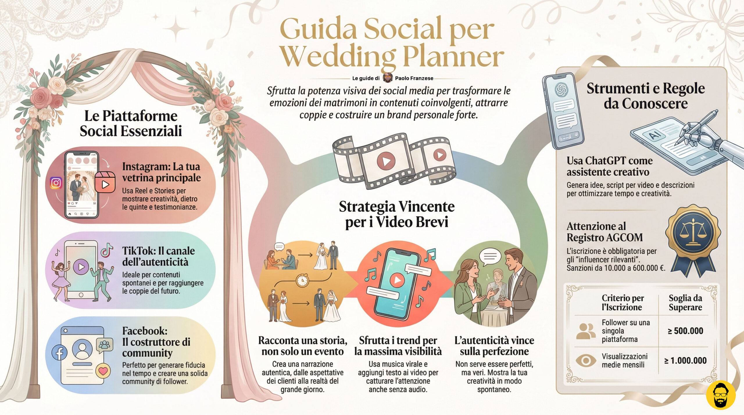Il settore del wedding sta vivendo una trasformazione digitale senza precedenti. Per aiutarvi a navigare tra algoritmi e nuove normative, ho deciso di farvi un regalo speciale: una Guida Social esclusiva per Wedding Planner. In questa infografica troverete una sintesi chiara delle piattaforme su cui puntare, i segreti per video brevi che catturano l'attenzione e, cosa fondamentale, un focus sulle regole AGCOM per evitare sanzioni. Uno strumento pratico da tenere sempre a portata di mano per far crescere il vostro brand.