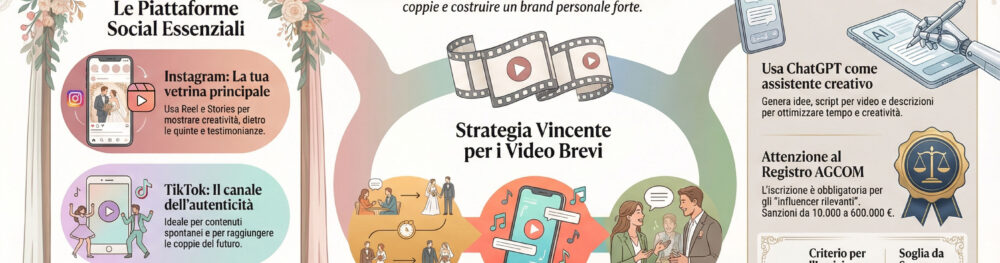 Il settore del wedding sta vivendo una trasformazione digitale senza precedenti. Per aiutarvi a navigare tra algoritmi e nuove normative, ho deciso di farvi un regalo speciale: una Guida Social esclusiva per Wedding Planner. In questa infografica troverete una sintesi chiara delle piattaforme su cui puntare, i segreti per video brevi che catturano l'attenzione e, cosa fondamentale, un focus sulle regole AGCOM per evitare sanzioni. Uno strumento pratico da tenere sempre a portata di mano per far crescere il vostro brand.