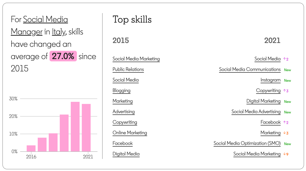 In Italia dal 2015 per i Social Media Manager le competenze sono cambiate in media del 27,0% e per i Marketing Specialist del 28,9%