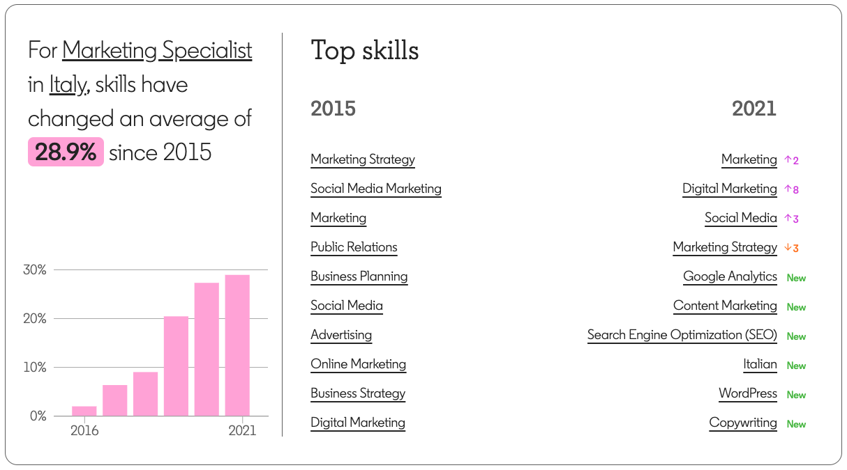 Per questo ti segnalo questo tool che LinkedIn ha messo a disposizione per capire come sono cambiate le abilità richieste dalle aziende in funzione di specifici lavori.