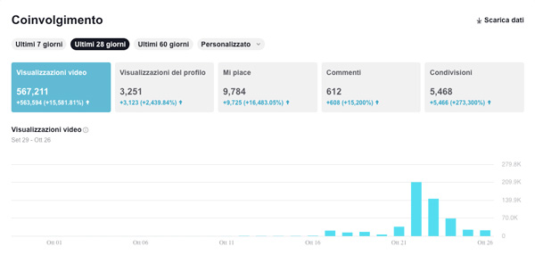 Negli ultimi 7 giorni, ho registrato una crescita fenomenale. Le visualizzazioni dei miei video sono aumentate del 848.27%, passando da 510956 a 957029 visualizzazioni. Questo dimostra l'efficacia della mia strategia di pubblicazione e della scelta accurata degli hashtag e della musica.