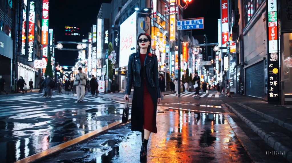 A stylish woman walks down a Tokyo street filled with warm glowing neon and animated city signage. She wears a black leather jacket, a long red dress, and black boots, and carries a black purse. She wears sunglasses and red lipstick. She walks confidently and casually. The street is damp and reflective, creating a mirror effect of the colorful lights. Many pedestrians walk about.
