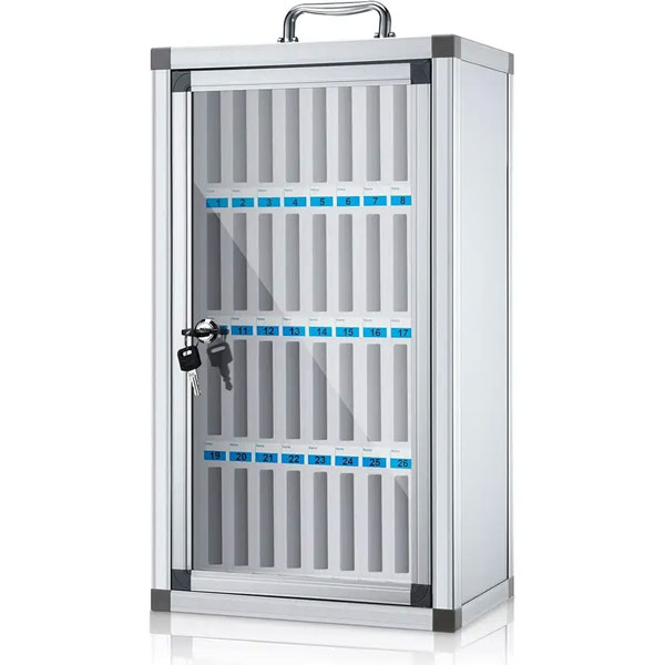 La valigetta ha scomparti numerati che corrispondono al numero del registro di ciascun alunno. Ogni studente inserisce il proprio dispositivo nello spazio assegnato.