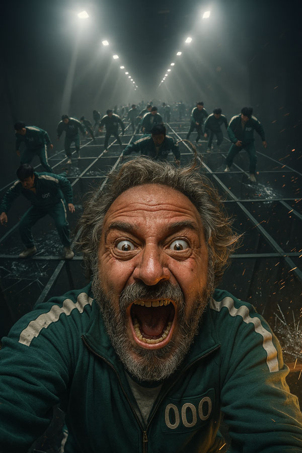 Un uomo in tuta verde con il numero "000" viene catturato in un intenso scatto primo piano in stile selfie, urlando per paura mentre si bilancia precariamente su fragili pannelli di vetro sospesi su un abisso buio.