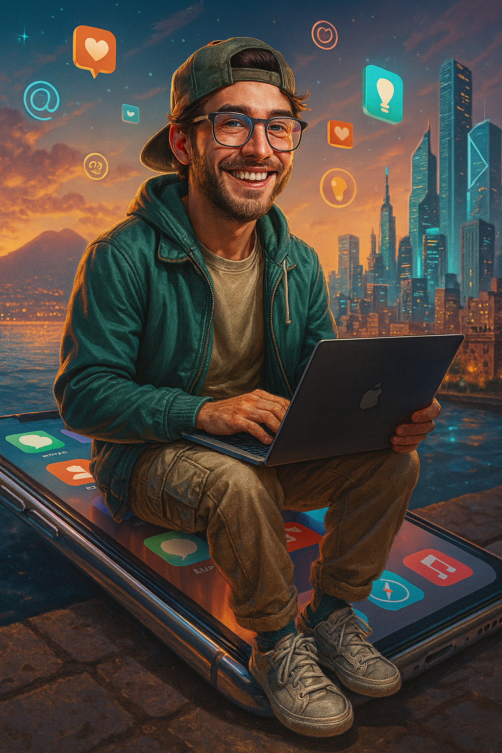 Lo sfondo Napoli, Vesuvio, Mare, fonde grattacieli cittadini, edifici futuristici e icone digitali galleggianti, simboleggiando tecnologia, creatività e social media.