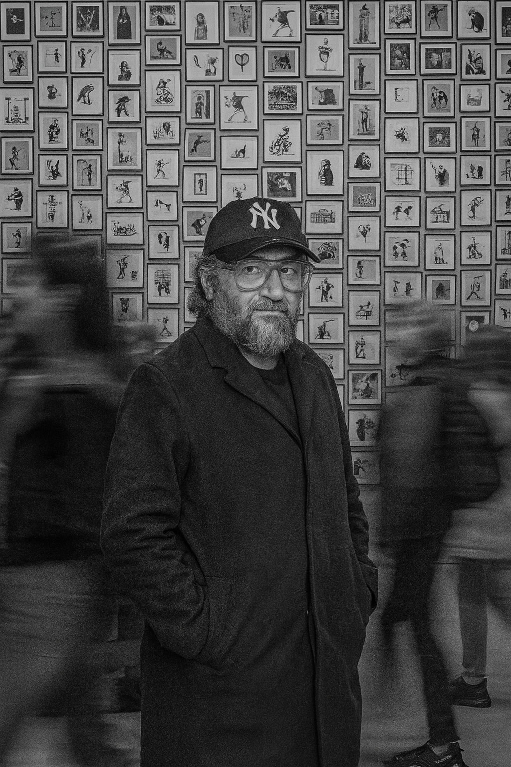 Una foto in bianco e nero scattata in una galleria d'arte moderna. La scena cattura un candido momento in stile "scatto rubato" di un uomo (io) fermo tra una folla in movimento.
